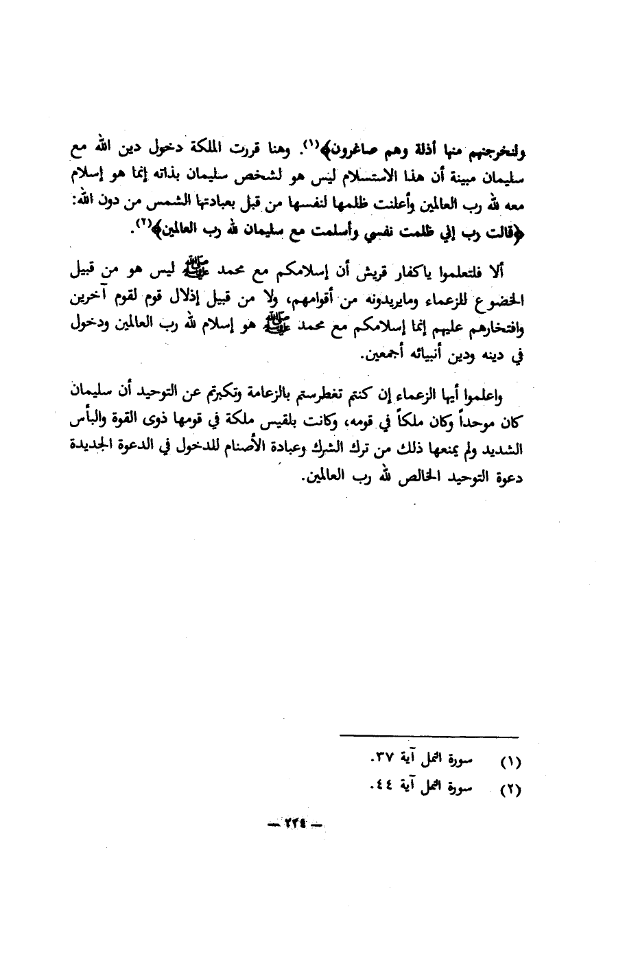 وَلَنُخْرِجَنَّهُمْ مِنْهَا أَذِلَّةً وَهُمْ صَاغِرُونَ} 1. وهنا قررت الملكة دخول دين الله مع سليمان مبينة أن هذا الاستسلام ليس هو لشخص سليمان بذاته إنما هو إسلام معه لله رب العالمين, وأعلنت ظلمها لنفسها من قبلُ بعبادتها الشمس من دون الله: {قَالَتْ رَبِّ إِنِّي ظَلَمْتُ نَفْسِي وَأَسْلَمْتُ مَعَ سُلَيْمَانَ لِلَّهِ رَبِّ الْعَالَمِينَ} 2.