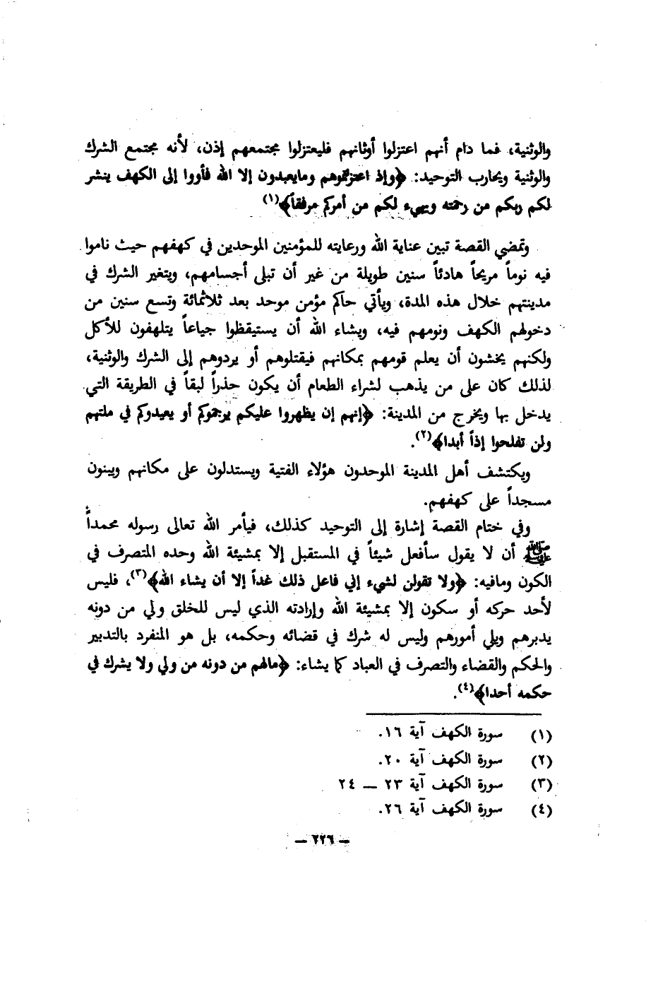وفي ختام القصة إشارة إلى التوحيد كذلك، فيأمر الله تعالى رسوله محمدًا صلى الله عليه وسلم أن لا يقول سأفعل شيئًا في المستقبل إلا بمشيئة الله وحده المتصرف في الكون ومافيه: {وَلا تَقُولَنَّ لِشَيْءٍ إِنِّي فَاعِلٌ ذَلِكَ غَداً, إِلاَّ أَنْ يَشَاءَ اللَّهُ} 3، فليس لأحد حركة أو سكون إلا بمشيئة الله وإراداته الذي ليس للخلق ولي من دونه يدبرهم ويلي أمورهم, وليس له شرك في قضائه وحكمه، بل هو المنفرد بالتدبير والحكم والقضاء والتصرف في العباد كما يشاء: {مَا لَهُمْ مِنْ دُونِهِ مِنْ وَلِيٍّ وَلا يُشْرِكُ فِي حُكْمِهِ أَحَداً} 4.