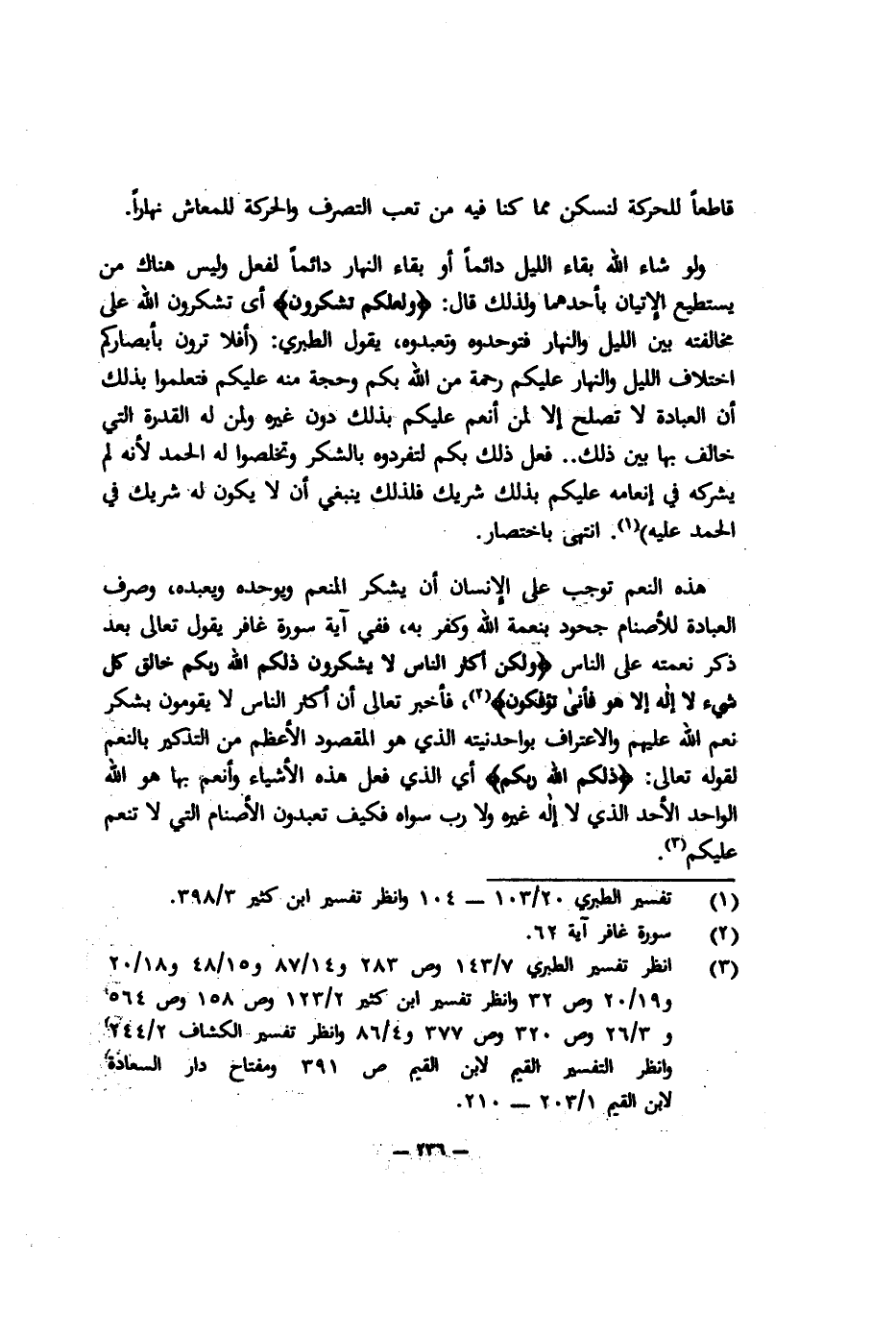 ولو شاء الله بقاء الليل دائمًا أو بقاء النهار دائمًا لفعل, وليس هناك من يستطيع الإتيان بأحدهما, ولذلك قال: {وَلَعَلَّكُمْ تَشْكُرُون} أي تشكرون الله على مخالفته بين الليل والنهار فتوحدوه وتعبدوه، يقول الطبري: "أفلا ترون بأبصاركم اختلاف الليل والنهار عليكم رحمة من الله بكم وحجة منه عليكم فتعلموا بذلك أن العبادة لا تصلح إلا لمن أنعم عليكم بذلك دون غيره ولمن له القدرة التي خالف بها بين ذلك ... فعل ذلك بكم لتفردوه بالشكر وتخلصوا له الحمد لأنه لم يشركه في إنعامه عليكم بذلك شريك؛ فلذلك ينبغي أن لا يكون له شريك في الحمد عليه"1 انتهى باختصار.