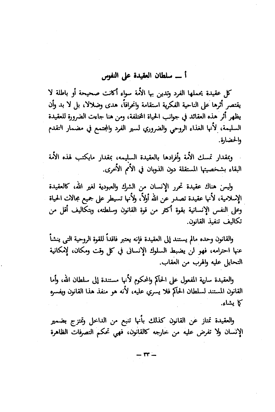 والعقيدة سارية المفعول على الحاكم والمحكوم؛ لأنها مستندة إلى سلطان الله، وأما القانون المستند لسلطان الحاكم فلا يسري عليه؛ لأنه هو منفذ هذا القانون ويفسره كما يشاء.