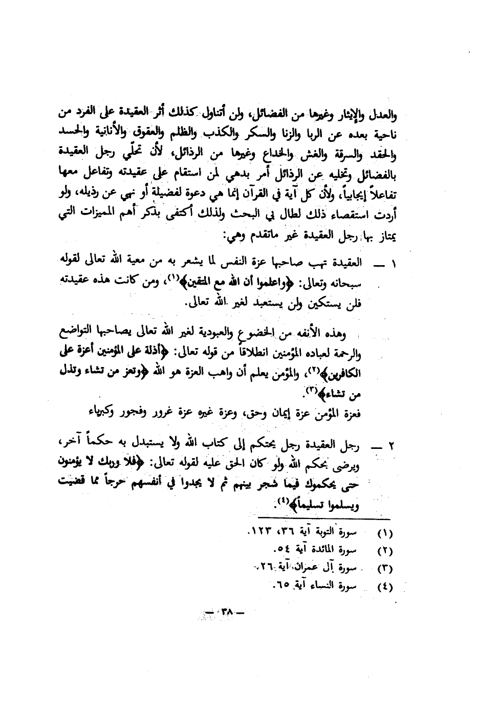 والعدل والإيثار وغيرها من الفضائل، ولن أتناول كذلك أثر العقيدة على الفرد من ناحية بعده عن الربا والزنا والسكر والكذب والظلم والعقوق والأنانية والحسد والحقد والسرقة والغش والخداع وغيرها من الرذائل؛ لأن تحلي رجل العقيدة بالفضائل وتخليه عن الرذائل أمر بدهي لمن استقام على عقيدته وتفاعل معها تفاعلًا إيجابيًّا، ولأن كل آية في القرآن إنما هي دعوة لفضيلة أو نهي عن رذيلة، ولو أردت استقصاء ذلك لطال بي البحث, ولذلك أكتفي بذكر أهم المميزات التي يمتاز بها رجل العقيدة غير ما تقدم وهي:
