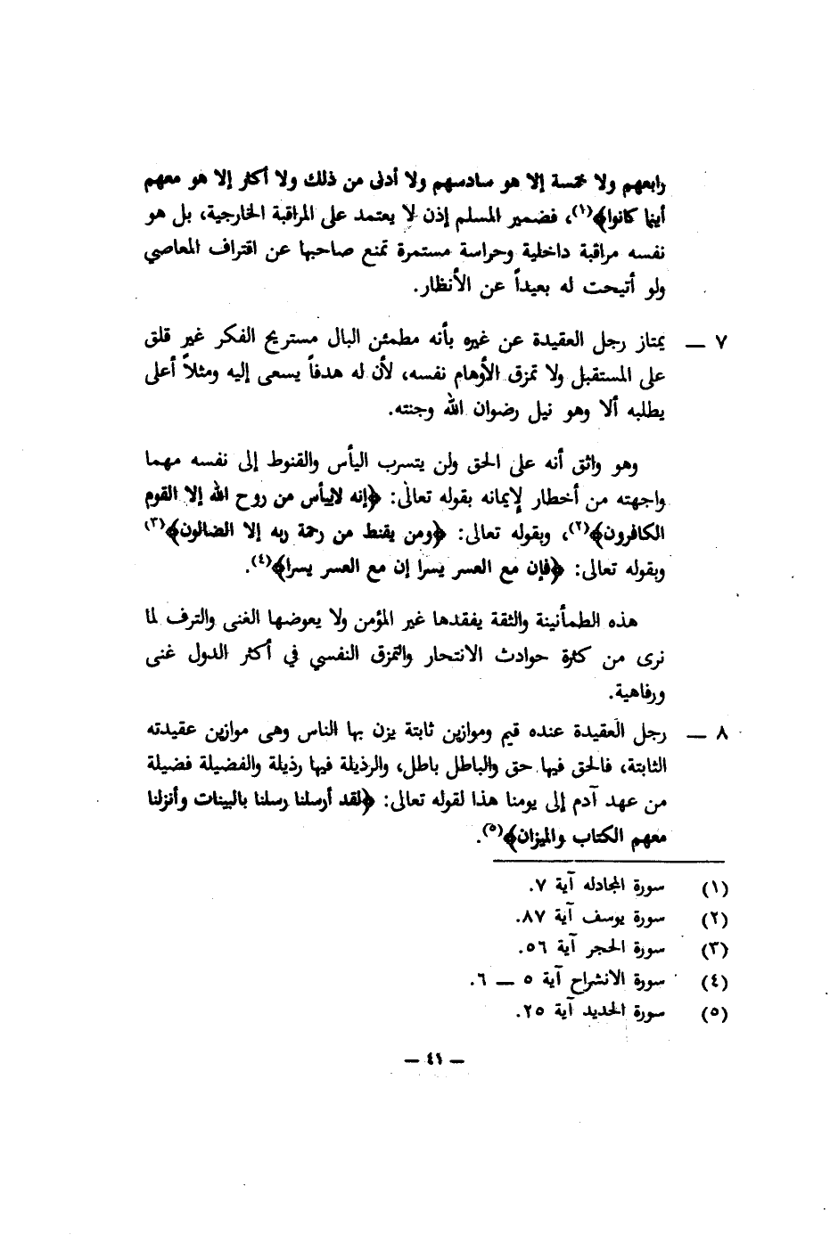 7- يمتاز رجل العقيدة عن غيره بأنه مطمئن البال, مستريح الفكر, غير قلق على المستقبل ولا تمزق الأوهام نفسه؛ لأن له هدفًا يسعى إليه ومثلًا أعلى يطلبه، ألا وهو نيل رضوان الله وجنته.