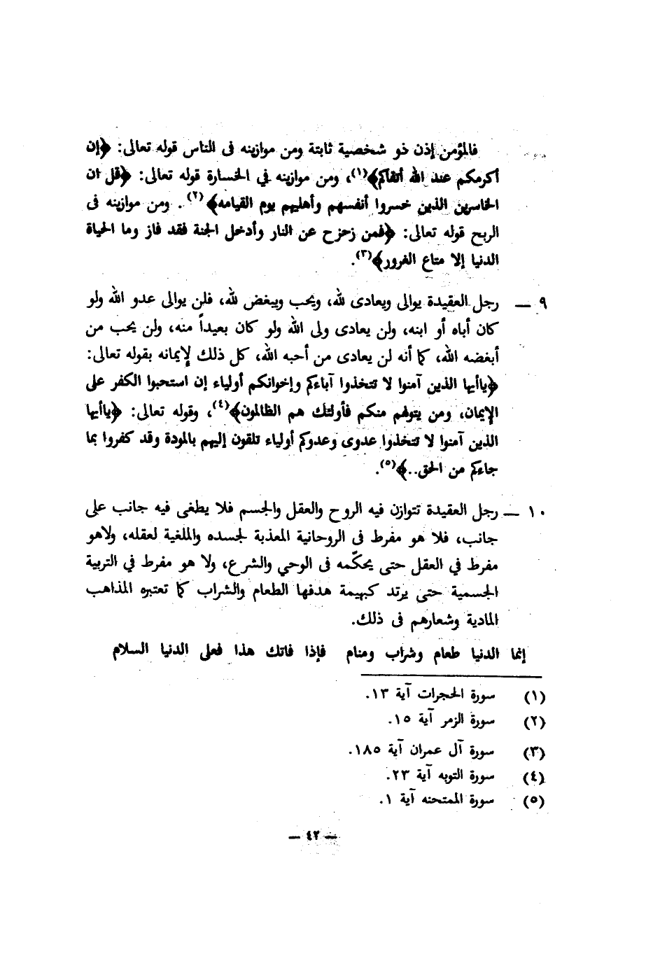 10- رجل العقيدة تتوازن فيه الروح والعقل والجسم, فلا يطغى فيه جانب على جانب، فلا هو مفرط في الروحانية المعذبة لجسده والملغية لعقله، ولا هو مفرط في العقل حتى يحكِّمه في الوحي والشرع، ولا هو مفرط في التربية الجسمية حتى يرتد كبهيمة هدفها الطعام والشراب كما تعتبره المذاهب المادية, وشعارهم في ذلك: