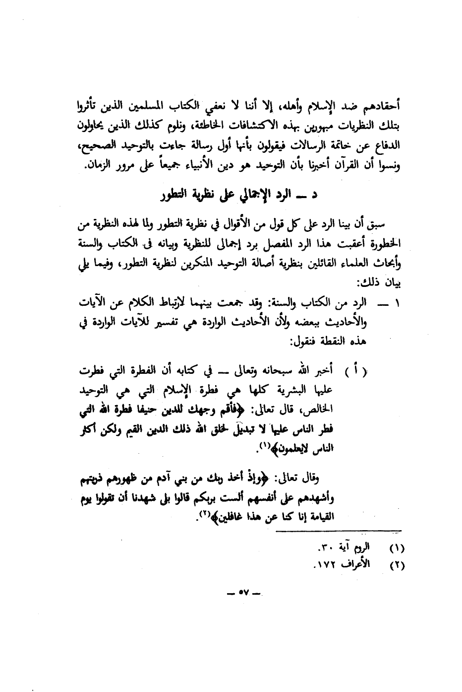 سبق أن بينا الرد على كل قول من الأقوال في نظرية التطور, ولما لهذه النظرية من الخطورة أعقبتُ هذا الرد المفصل برد إجمالي للنظرية وبيانه في الكتاب والسنة وأبحاث العلماء القائلين بنظرية أصالة التوحيد المنكرين لنظرية التطور، وفيما يلي بيان ذلك: