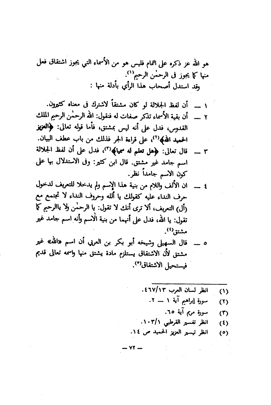 5- قال السهيلي وشيخه أبو بكر ابن العربي أن اسم "الله" غير مشتق؛ لأن الاشتقاق يستلزم مادة يشتق منها واسمه تعالى قديم فيستحيل الاشتقاق5.