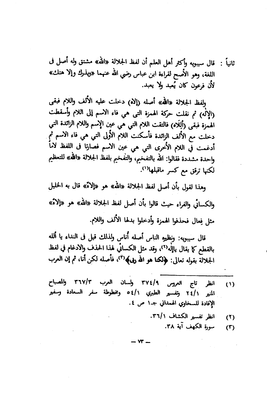 ثانيًا: قال سيبويه: وأكثر أهل العلم أن لفظ الجلالة "الله" مشتق وله أصل في اللغة، وهو الأصح لقراءة ابن عباس رضي الله عنهما "ويذرك وإلاهتك" لأن فرعون كان يعبد ولا يعبد.