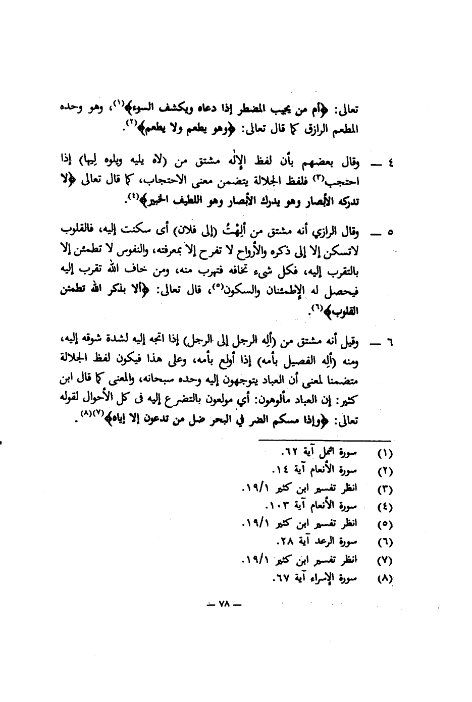 5- وقال الرازي: إنه مشتق من ألِهتُ "إلى فلان" أي سكنت إليه، فالقلوب لا تسكن إلا إلى ذكره، والأرواح لا تفرح إلا بمعرفته، والنفوس لا تطمئن إلا بالتقرب إليه، فكل شيء تخافه فتهرب منه، ومن خاف الله تقرب إليه فيحصل له الاطمئنان والسكون5، قال تعالى: {أَلا بِذِكْرِ اللَّهِ تَطْمَئِنُّ الْقُلُوب} 6.