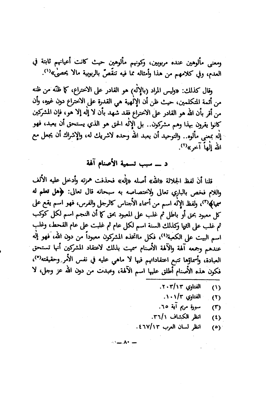 قلنا: إن لفظ الجلالة "الله" أصله "إله" فحذفت همزته وأدخل عليه الألف واللام فخص بالباري تعالى ولاختصاصه به سبحانه قال تعالى: {هَلْ تَعْلَمُ لَهُ سَمِيّا} 1، ولفظ الإله اسم من أسماء الأجناس كالرجل والفرس، فهو اسم يقع على كل معبود بحق أو باطل ثم غلب على المعبود بحق, كما أن النجم اسم لكل كوكب ثم غلب على الثريا, وكذلك السنة اسم لكل عام ثم غلبت على عام القحط، وغلب اسم البيت على الكعبة2، فكل ما اتخذه المشركون معبودًا من دون الله، فهو إله عندهم وجمعه آلهة, والآلهة الأصنام سميت بذلك لاعتقاد المشركين أنها تستحق العبادة، وأسماؤها تتبع اعتقاداتهم فيها لا ما هي عليه في نفس الأمر وحقيقته3، فكون هذه الأصنام أُطلق عليها اسم الآلهة، وعبدت من دون الله عز وجل، لا