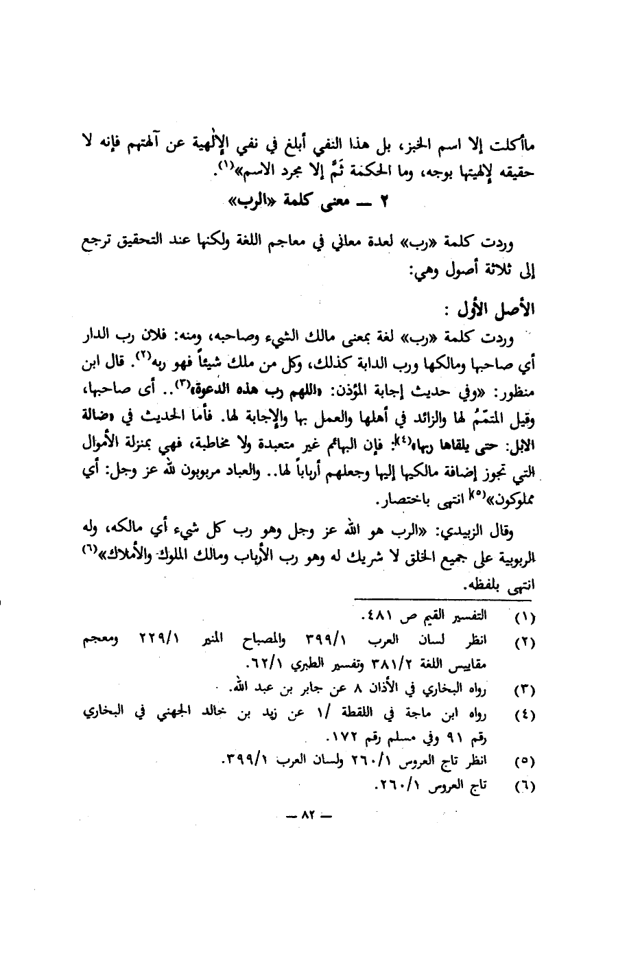 وقال الزبيدي: "الرب هو الله عز وجل وهو رب كل شيء أي مالكه، وله الربوبية على جميع الخلق لا شريك له, وهو رب الأرباب ومالك الملوك والأملاك6" انتهى بلفظه.