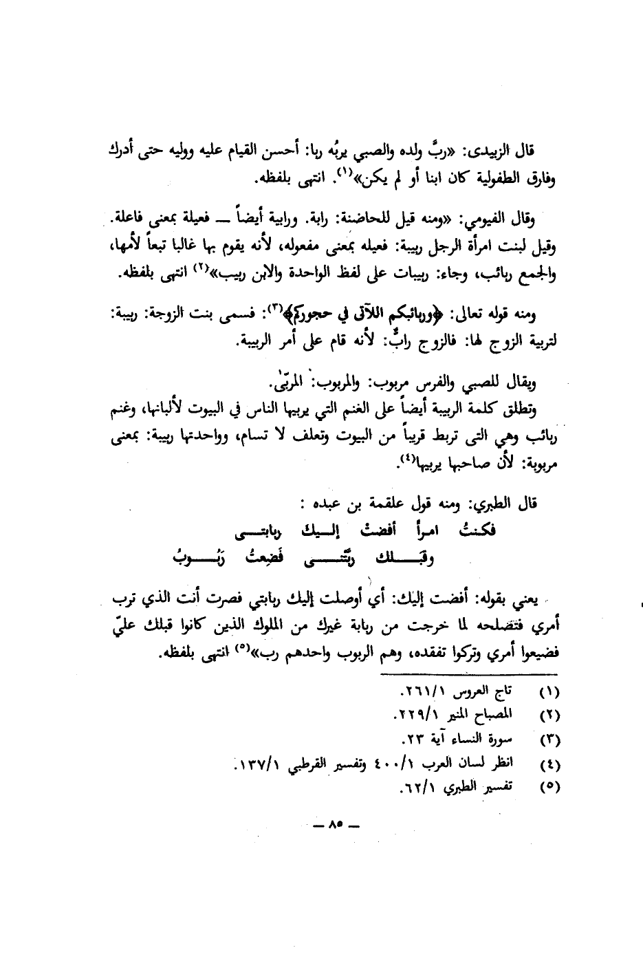 ومنه قوله تعالى: {وَرَبَائِبُكُمْ اللاَّتِي فِي حُجُورِكُم} 3: فسمى بنت الزوجة: ربيبة لتربية الزوج لها, فالزوج رابٌّ؛ لأنه قام على أمر الربيبة.