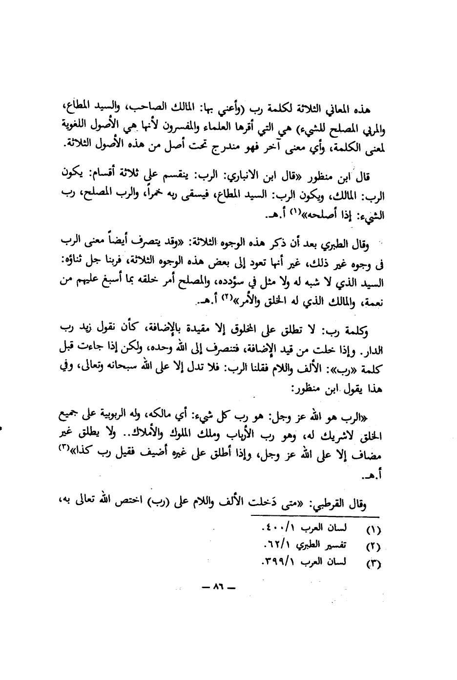 هذه المعاني الثلاثة لكلمة رب "وأعني بها: المالك الصاحب، والسيد المطاع، والمربي المصلح للشيء" هي التي أقرها العلماء والمفسرون لأنها هي الأصول اللغوية لمعنى الكلمة، وأي معنى آخر فهو مندرج تحت أصل من هذه الأصول الثلاثة.