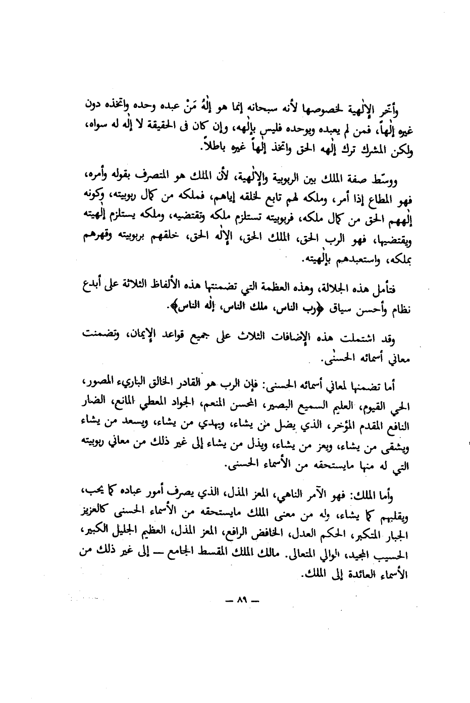 ووسّط صفة الملك بين الربوبية والإلهية؛ لأن الملك هو المتصرف بقوله وأمره، فهو المطاع إذا أمر، وملكه لهم تابع لخلقه إياهم، فملكه من كمال ربوبيته، وكونه إلههم الحق من كمال ملكه، فربوبيته تستلزم ملكه وتقتضيه، وملكه يستلزم إلهيته ويقتضيها، فهو الرب الملك الحق، الإله الحق، خلقهم بربوبيته وقهرهم بملكه، واستعبدهم بإلهيته.