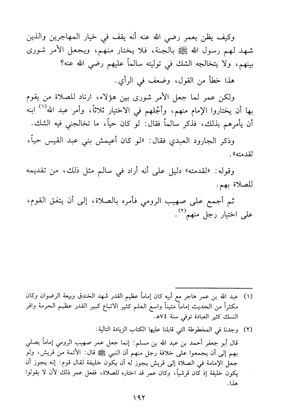 وَلَكِنَّ عُمَرَ لَمَّا جَعَلَ الْأَمْرَ شُورَى بَيْنَ هَؤُلَاءِ، ارْتَادَ لِلصَّلَاةِ مَنْ يَقُومُ بِهَا أَنْ يَخْتَارُوا الْإِمَامَ مِنْهُمْ وَأَجَّلَهُمْ فِي الِاخْتِيَارِ ثَلَاثًا، وَأَمَرَ عَبْدَ اللَّهِ1 ابْنَهُ أَنْ يَأْمُرَهُمْ بِذَلِكَ، فَذَكَرَ سَالِمًا فَقَالَ: لَوْ كَانَ حَيًّا، مَا تَخَالَجَنِي فِيهِ الشَّكُّ.