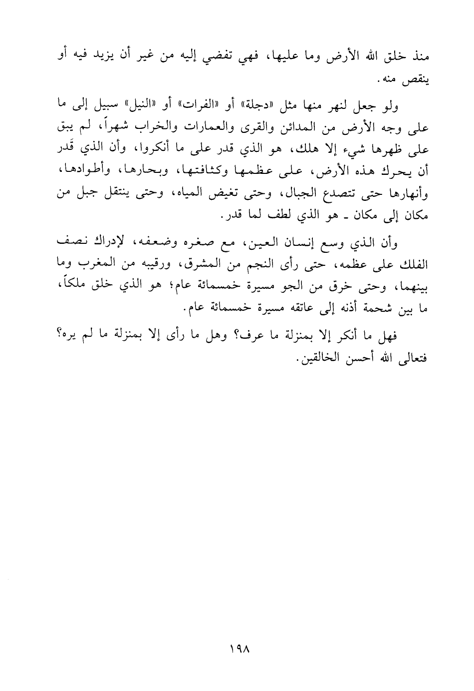 وَلَوْ جُعِلَ لِنَهْرٍ مِنْهَا مِثْلِ "دِجْلَةَ" أَوِ "الْفُرَاتِ" أَوِ "النِّيلِ" سَبِيلٌ إِلَى مَا عَلَى وَجْهِ الْأَرْضِ مِنَ الْمَدَائِنِ وَالْقُرَى وَالْعِمَارَاتِ وَالْخَرَابِ شَهْرًا، لَمْ يَبْقَ عَلَى ظَهْرِهَا شَيْءٌ إِلَّا هَلَكَ، هُوَ الَّذِي قَدَرَ عَلَى مَا أَنْكَرُوا، وَأَنَّ الَّذِي قَدَرَ أَنْ يُحَرِّكَ هَذِهِ الْأَرْضَ، عَلَى عِظَمِهَا وَكَثَافَتِهَا، وَبِحَارِهَا، وَأَطْوَادِهَا، وَأَنْهَارِهَا حَتَّى تَتَصَدَّعَ الْجِبَالُ، وَحَتَّى تَغِيضَ الْمِيَاهُ، وَحَتَّى يَنْتَقِلَ جَبَلٌ مِنْ مَكَانٍ إِلَى مَكَانٍ -هُوَ الَّذِي لَطَفَ لِمَا قَدَّرَ.