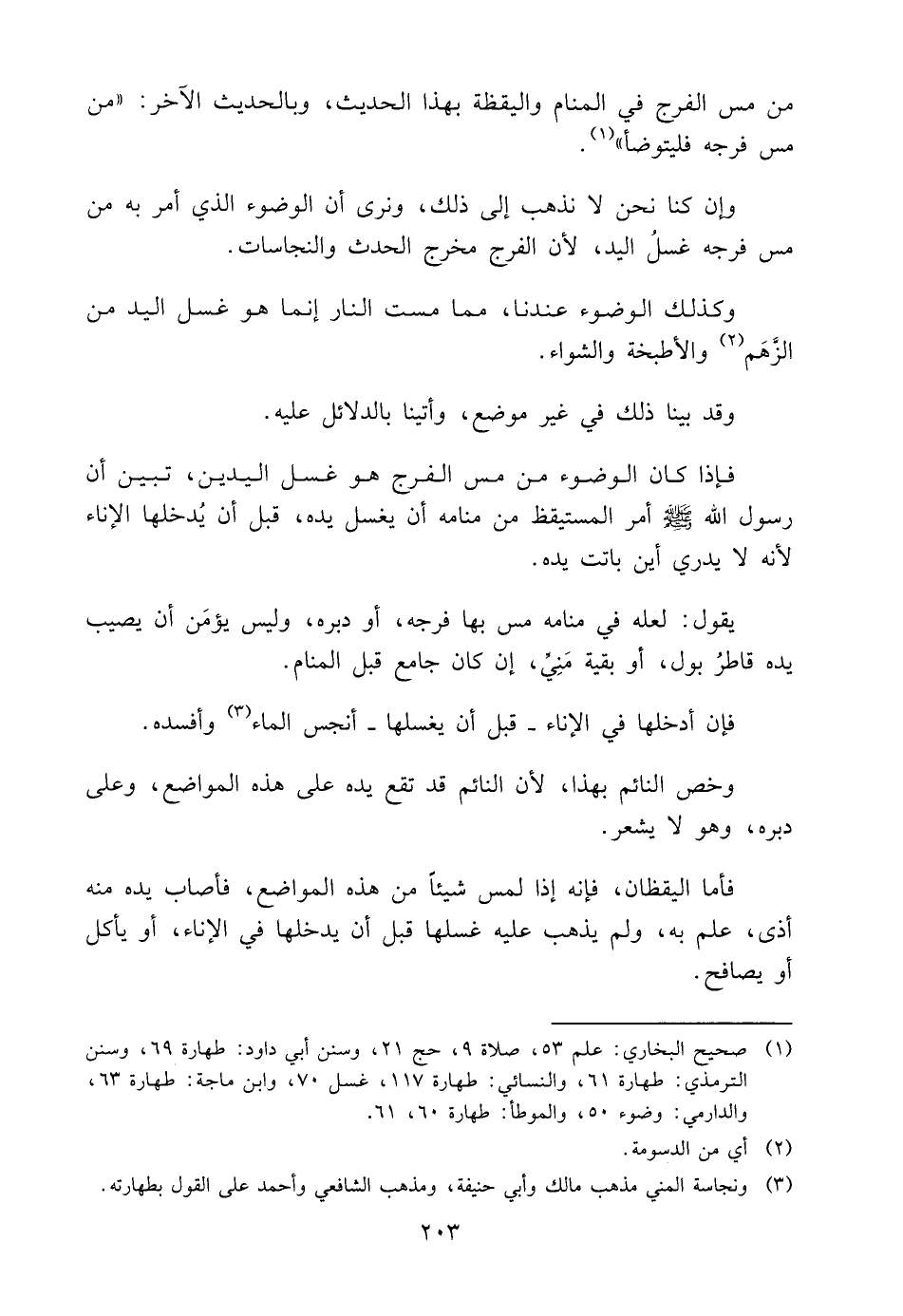 من مَسَّ الْفَرْجَ فِي الْمَنَامِ وَالْيَقَظَةِ بِهَذَا الْحَدِيثِ، وَبِالْحَدِيثِ الْآخَرِ: "مَنْ مَسَّ فَرْجَهُ فَلْيَتَوَضَّأْ" 1.