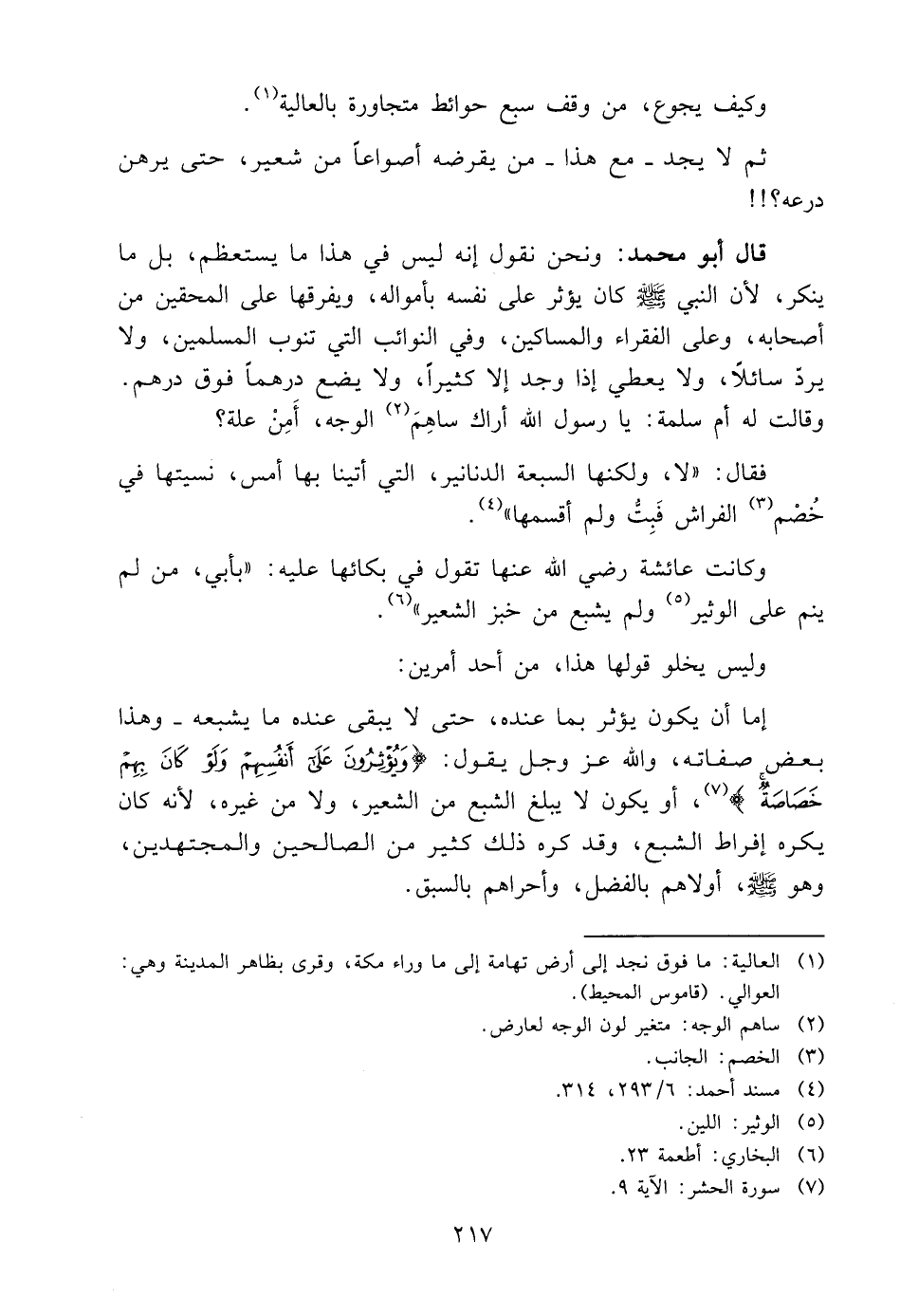 إِمَّا أَنْ يَكُونَ يُؤْثِرُ بِمَا عِنْدَهُ، حَتَّى لَا يَبْقَى عِنْدَهُ مَا يُشْبِعُهُ -وَهَذَا بَعْضُ صِفَاتِهِ، وَاللَّهُ عَزَّ وَجَلَّ يَقُولُ: {وَيُؤْثِرُونَ عَلَى أَنْفُسِهِمْ وَلَوْ كَانَ بِهِمْ خَصَاصَةٌ} 7، أَوْ يَكُونُ لَا يَبْلُغُ الشِّبَعَ مِنَ الشَّعِيرِ، وَلَا مِنْ غَيْرِهِ، لِأَنَّهُ كَانَ يَكْرَهُ إِفْرَاطَ الشِّبَعِ، وَقَدْ كَرِهَ ذَلِكَ كَثِيرٌ مِنَ الصَّالِحِينَ وَالْمُجْتَهِدِينَ، وَهُوَ صَلَّى اللَّهُ عَلَيْهِ وَسَلَّمَ، أَوْلَاهُمْ بِالْفَضْلِ، وأحراهم بِالسَّبقِ،
