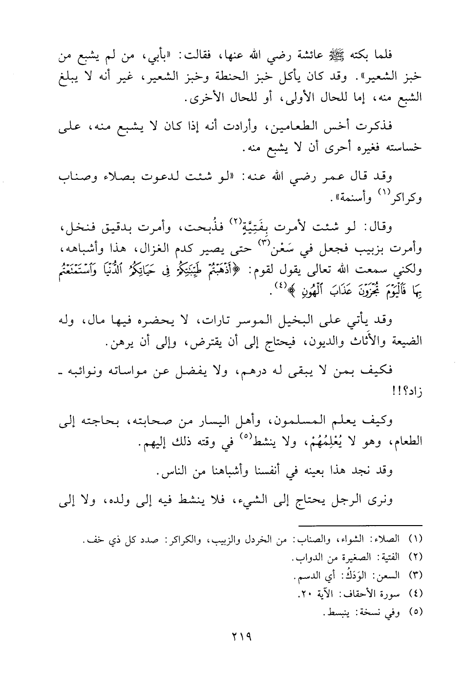 وَقَالَ: لَوْ شِئْتُ لَأَمَرَتُ بِفَتِيَّةٍ2 فَذُبِحَتْ، وَأَمَرْتُ بِدَقِيقٍ فَنُخِلَ، وَأَمَرْتُ بِزَبِيبٍ فَجُعِلَ فِي سَعْنٍ3 حَتَّى يَصِيرَ كَدَمِ الْغَزَالِ، هَذَا وَأَشْبَاهُهُ، وَلَكِنِّي سَمِعْتُ اللَّهَ تَعَالَى يَقُولُ لِقَوْمٍ: {أَذْهَبْتُمْ طَيِّبَاتِكُمْ فِي حَيَاتِكُمُ الدُّنْيَا وَاسْتَمْتَعْتُمْ بِهَا فَالْيَوْمَ تُجْزَوْنَ عَذَابَ الْهُونِ} 4.