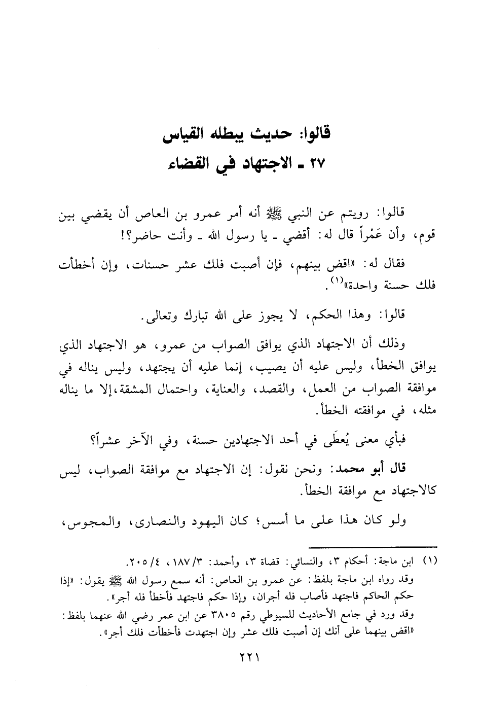 قَالُوا: رُوِّيتُمْ عَنِ النَّبِيَّ صَلَّى اللَّهُ عَلَيْهِ وَسَلَّمَ أَنَّهُ أَمَرَ عَمْرَو بْنَ الْعَاصِ أَنْ يَقْضِيَ بَيْنَ قَوْمٍ، وَأَنَّ عَمْرًا قَالَ لَهُ: أَقْضِي -يَا رَسُولَ اللَّهِ- وَأَنْتَ حَاضِرٌ؟!
