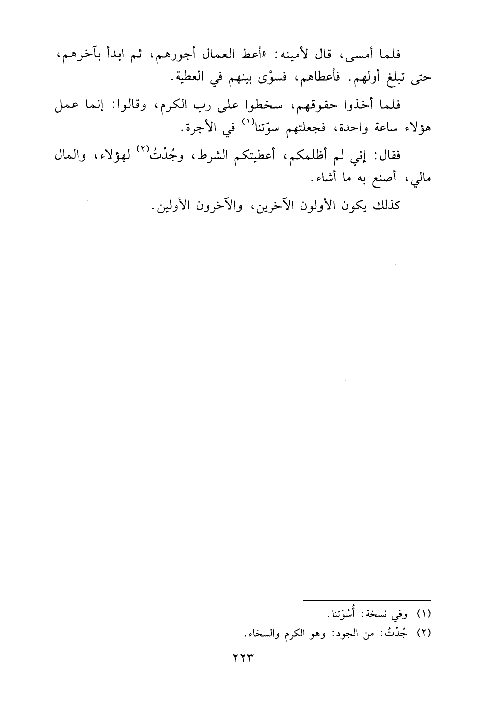 فَلَمَّا أَمْسَى، قَالَ لِأَمِينِهِ: "أَعْطِ الْعُمَّالَ أُجُورَهُمْ، ثُمَّ ابْدَأْ بِآخِرِهِمْ، حَتَّى تَبْلُغَ أَوَّلَهُمْ. فَأَعْطَاهُمْ فَسَوَّى بَيْنَهُمْ فِي الْعَطِيَّةِ".