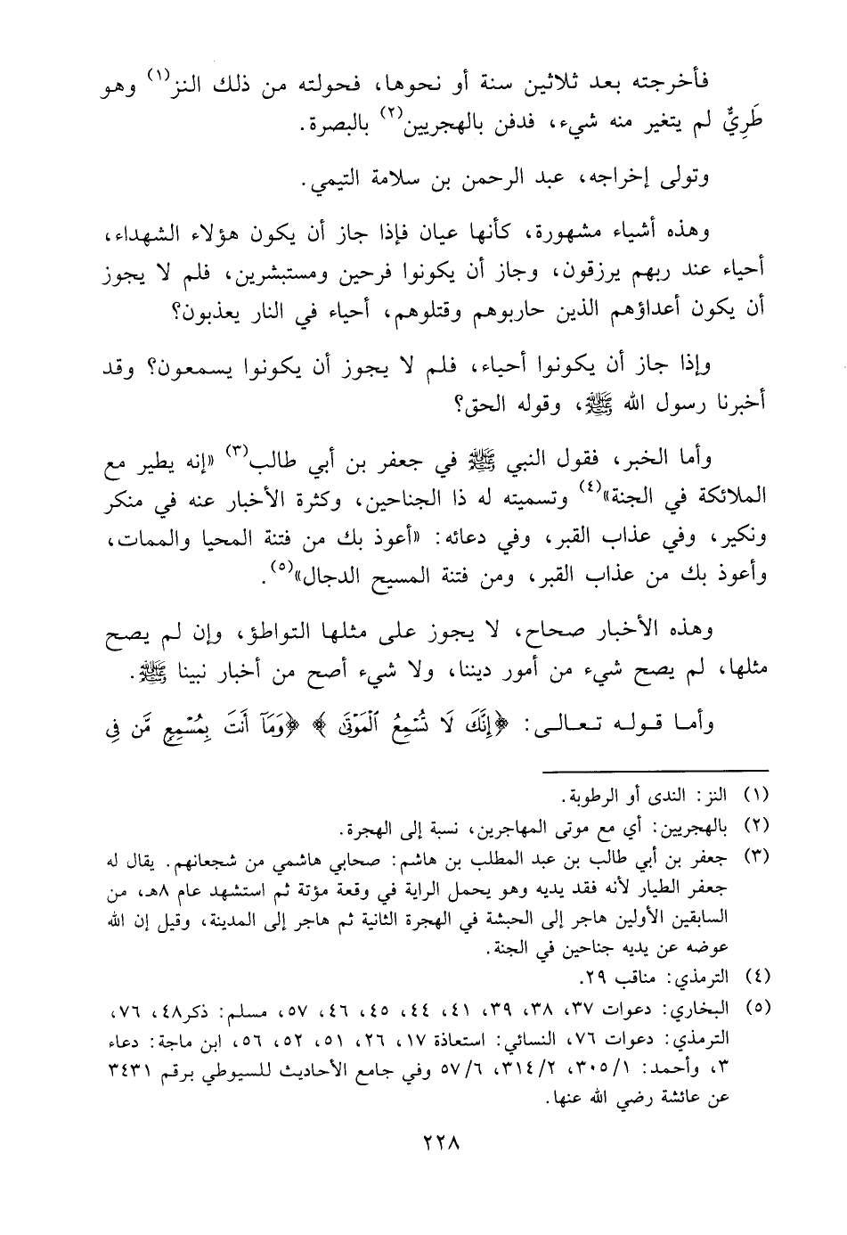 وَهَذِهِ أَشْيَاءُ مَشْهُورَةٌ، كَأَنَّهَا عِيَانٌ فَإِذَا جَازَ أَنْ يَكُونَ هَؤُلَاءِ الشُّهَدَاءُ، أَحْيَاءً عِنْدَ رَبِّهِمْ يُرْزَقُونَ، وَجَازَ أَنْ يَكُونُوا فَرِحِينَ وَمُسْتَبْشِرِينَ، فَلِمَ لَا يَجُوزُ أَنْ يَكُونَ أَعْدَاؤُهُمُ الَّذِينَ حَارَبُوهُمْ وَقَتَلُوهُمْ، أَحْيَاءً فِي النَّارِ يُعَذَّبُونَ؟