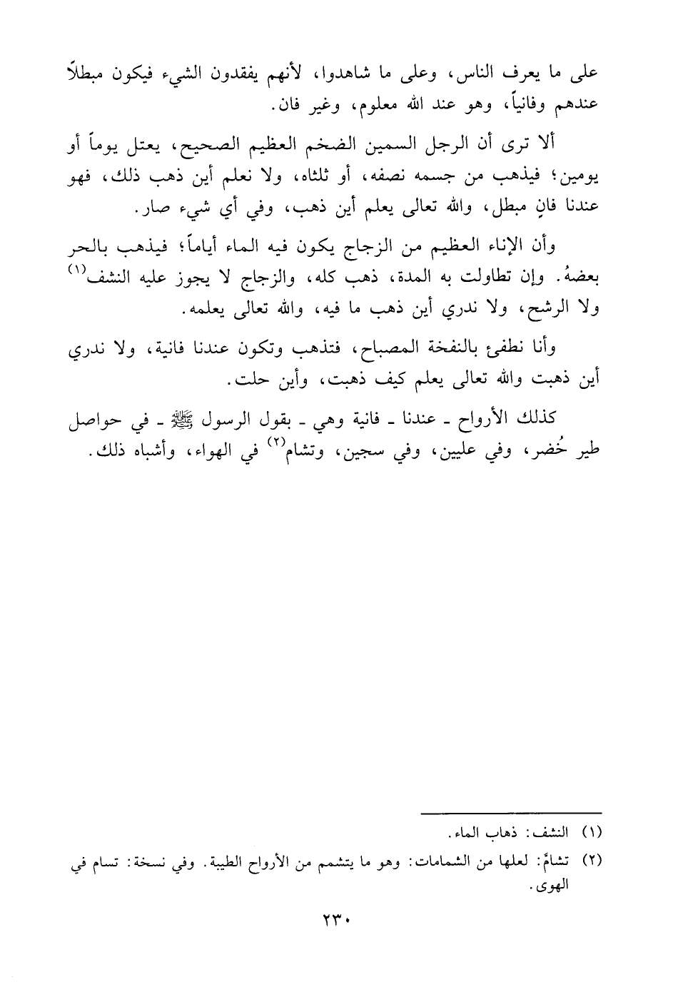أَلَا تَرَى أَنَّ الرَّجُلَ السَّمِينَ الضَّخْمَ الْعَظِيمَ الصَّحِيحَ، يَعْتَلُّ يَوْمًا أَوْ يَوْمَيْنِ، فَيَذْهَبُ مِنْ جِسْمِهِ نِصْفُهُ، أَوْ ثُلُثَاهُ، وَلَا نَعْلَمُ أَيْنَ ذَهَبَ ذَلِكَ، فَهُوَ عِنْدَنَا فَانٍ مُبْطَلٌ، وَاللَّهُ تَعَالَى يَعْلَمُ أَيْنَ ذَهَبَ، وَفِي أَيِّ شَيْءٍ صَارَ.