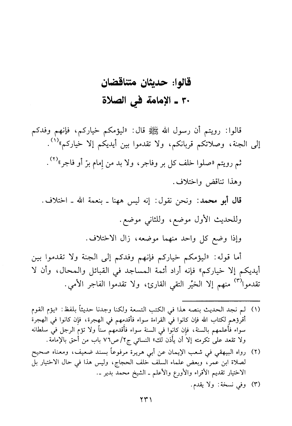 2 رَوَاهُ الْبَيْهَقِيّ فِي شعب الْإِيمَان عَن أبي هُرَيْرَة مَرْفُوعا بِسَنَد ضَعِيف، وَمَعْنَاهُ صَحِيح لصَلَاة ابْن عمر، وَبَعض عُلَمَاء السّلف خَالف الْحجَّاج، وَلَيْسَ هَذَا فِي حَال الِاخْتِيَار بل الِاخْتِيَار تَقْدِيم الْأَقْرَاء والأورع والأعلم -الشَّيْخ مُحَمَّد بدير.