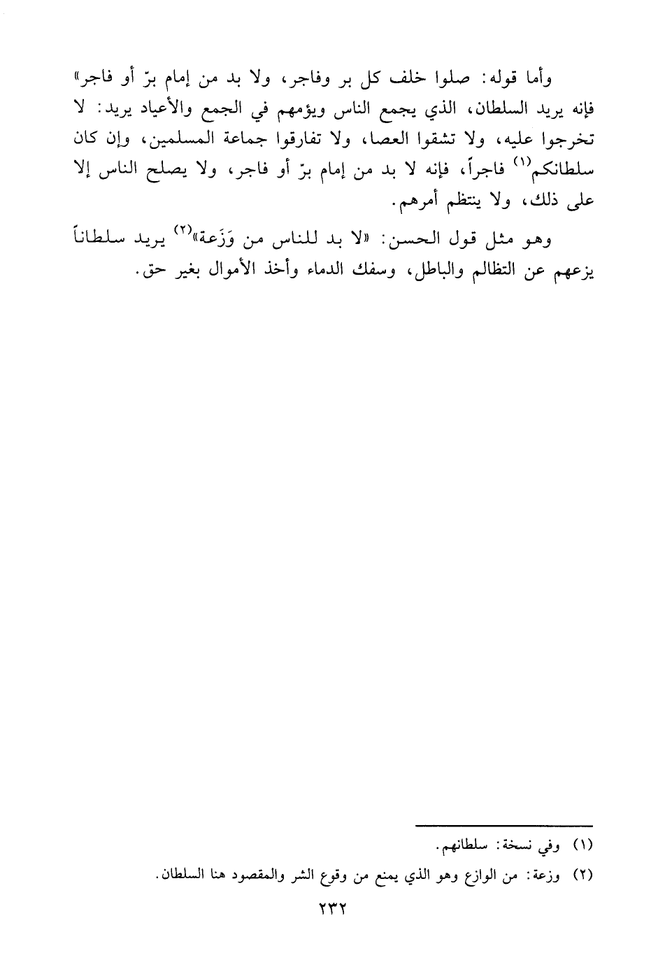 وَهُوَ مِثْلُ قَوْلِ الْحَسَنِ: "لَا بُدَّ لِلنَّاسِ مِنْ وَزَعَةٍ"2 يُرِيدُ سُلْطَانًا يَزَعُهُمْ عَنِ التَّظَالُمِ وَالْبَاطِلِ، وَسَفْكِ الدِّمَاءِ وَأَخْذِ الْأَمْوَالِ بِغَيْر حق.