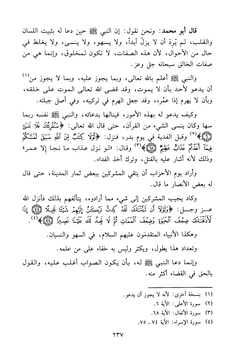 وَنَحْنُ نَقُولُ: أَنَّ النَّبِيَّ صَلَّى اللَّهُ عَلَيْهِ وَسَلَّمَ حِينَ دَعَا لَهُ بِتَثْبِيتِ اللِّسَانِ وَالْقَلْبِ، لَمْ يُرِدْ أَنْ لَا يَزَلَّ أَبَدًا، وَلَا يَسْهُوَ، وَلَا يَنْسَى، وَلَا يَغْلَطَ فِي حَالٍ مِنَ الْأَحْوَالِ، لِأَنَّ هَذِهِ الصِّفَاتِ، لَا تَكُونُ لِمَخْلُوقٍ، وَإِنَّمَا هِيَ مِنْ صِفَاتِ الْخَالِقِ سُبْحَانَهُ جَلَّ وَعَزَّ.