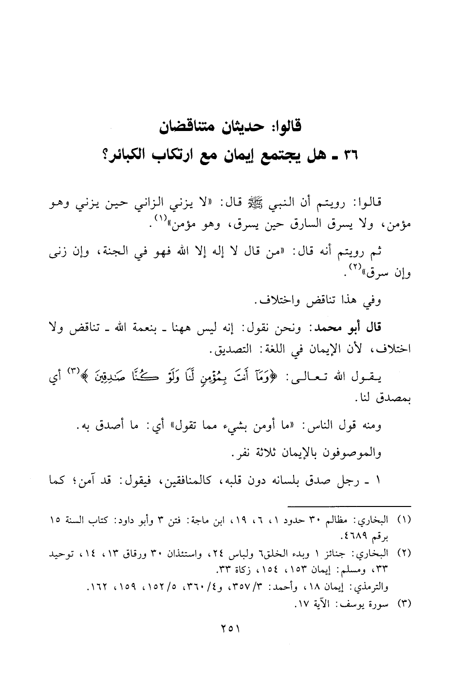قَالُوا: رُوِّيتُمْ أَنَّ النَّبِيَّ صَلَّى اللَّهُ عَلَيْهِ وَسَلَّمَ قَالَ: " لَا يَزْنِي الزَّانِي حِينَ يَزْنِي وَهُوَ مُؤْمِنٌ، وَلَا يَسْرِقُ السَّارِقُ حِينَ يَسْرِقُ، وَهُوَ مُؤْمِنٌ" 1.