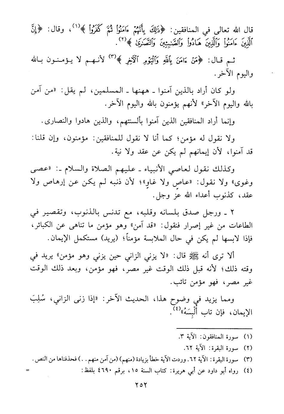 4 رَوَاهُ أَبُو دَاوُد عَن أبي هُرَيْرَة: كتاب السّنة 15، برقم 4690 بِلَفْظ: "إِذا زنى الرجل خرج مِنْهُ الْإِيمَان وَكَانَ عَلَيْهِ كالظلة، فَإِذا انقلع رَجَعَ إِلَيْهِ الْإِيمَان".