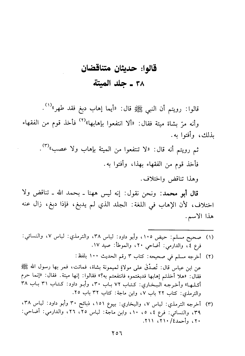 وَنَحْنُ نَقُولُ: إِنَّه لَيْسَ هَهُنَا -بِحَمْدِ اللَّهِ- تَنَاقُضٌ وَلَا اخْتِلَافٌ، لِأَنَّ الْإِهَابَ فِي اللُّغَةِ: الْجِلْدُ الَّذِي لَمْ يُدْبَغْ، فَإِذَا دُبِغَ، زَالَ عَنهُ هَذَا الِاسْم.