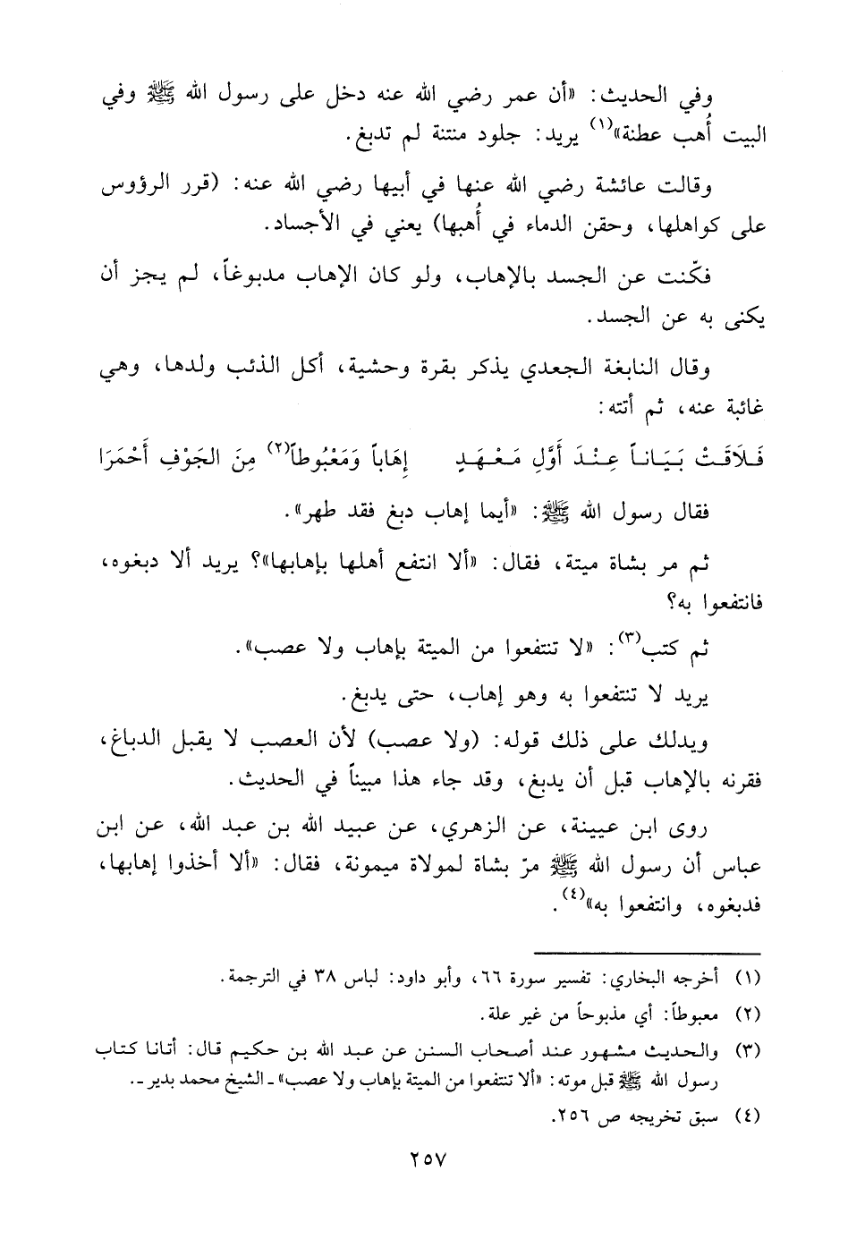 3 والْحَدِيث مَشْهُور عِنْد أَصْحَاب السّنَن عَن عبد الله بن حَكِيم قَالَ: أنانًا كتاب رَسُولِ اللَّهِ صَلَّى اللَّهُ عَلَيْهِ وَسلم قبل مَوته: "أَلا تَنْتَفِعُوا مِنَ الْمَيْتَةِ بِإِهَابٍ وَلَا عصب" -الشَّيْخ مُحَمَّد بدير-.