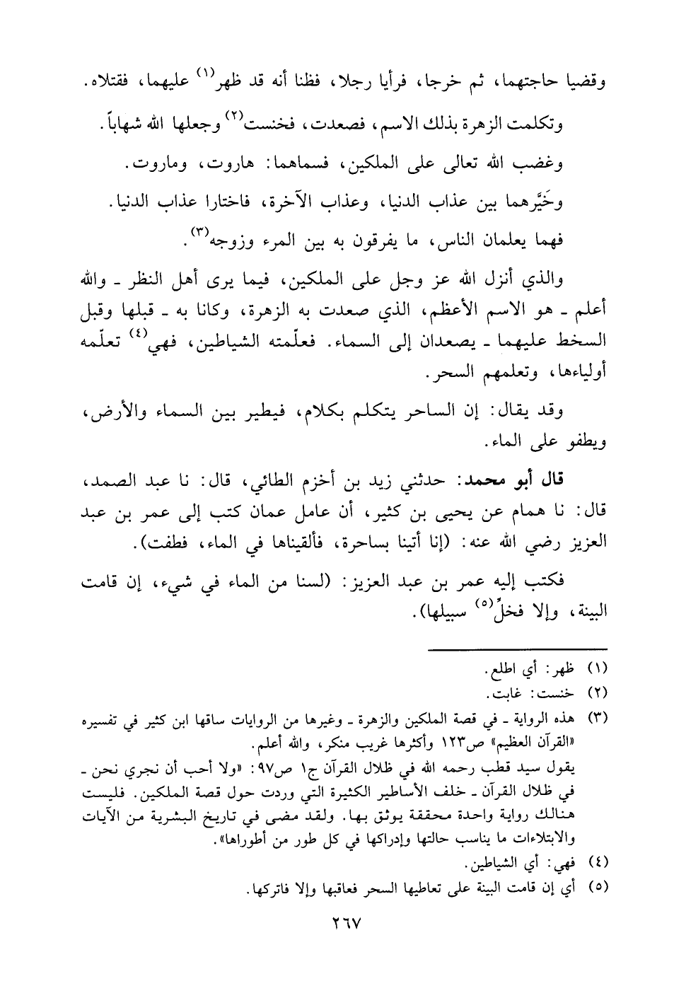 وَالَّذِي أَنْزَلَ اللَّهُ عَزَّ وَجَلَّ عَلَى الْمَلَكَيْنِ، فِيمَا يَرَى أَهْلُ النَّظَرِ -وَاللَّهُ أَعْلَمُ- هُوَ الِاسْمُ الْأَعْظَمُ. الَّذِي صَعِدَتْ بِهِ الزُّهَرَةُ، وَكَانَا بِهِ -قَبْلَهَا وَقَبْلَ السُّخْطِ عَلَيْهِمَا- يَصْعَدَانِ إِلَى السَّمَاءِ. فَعَلِمَتْهُ الشَّيَاطِينُ، فَهِيَ4 تُعَلِّمُهُ أَوْلِيَاءَهَا، وَتُعَلِّمُهُمُ السِّحْرَ.
