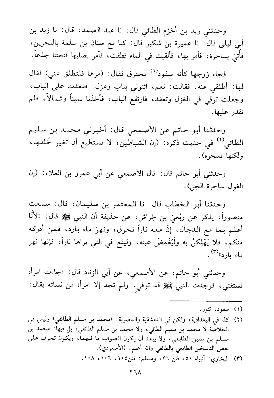 وَحَدَّثَنَا أَبُو حَاتِمٍ عَنِ الْأَصْمَعِيِّ قَالَ: أَخْبَرَنِي مُحَمَّدُ بْنُ سُلَيْمٍ الطَّائِيُّ2 فِي حَدِيثٍ ذَكَرَهُ: "إِنَّ الشَّيَاطِينَ، لَا تَسْتَطِيعُ أَنْ تُغَيِّرَ خَلْقَهَا، وَلَكِنَّهَا تَسْحَرُهُ".