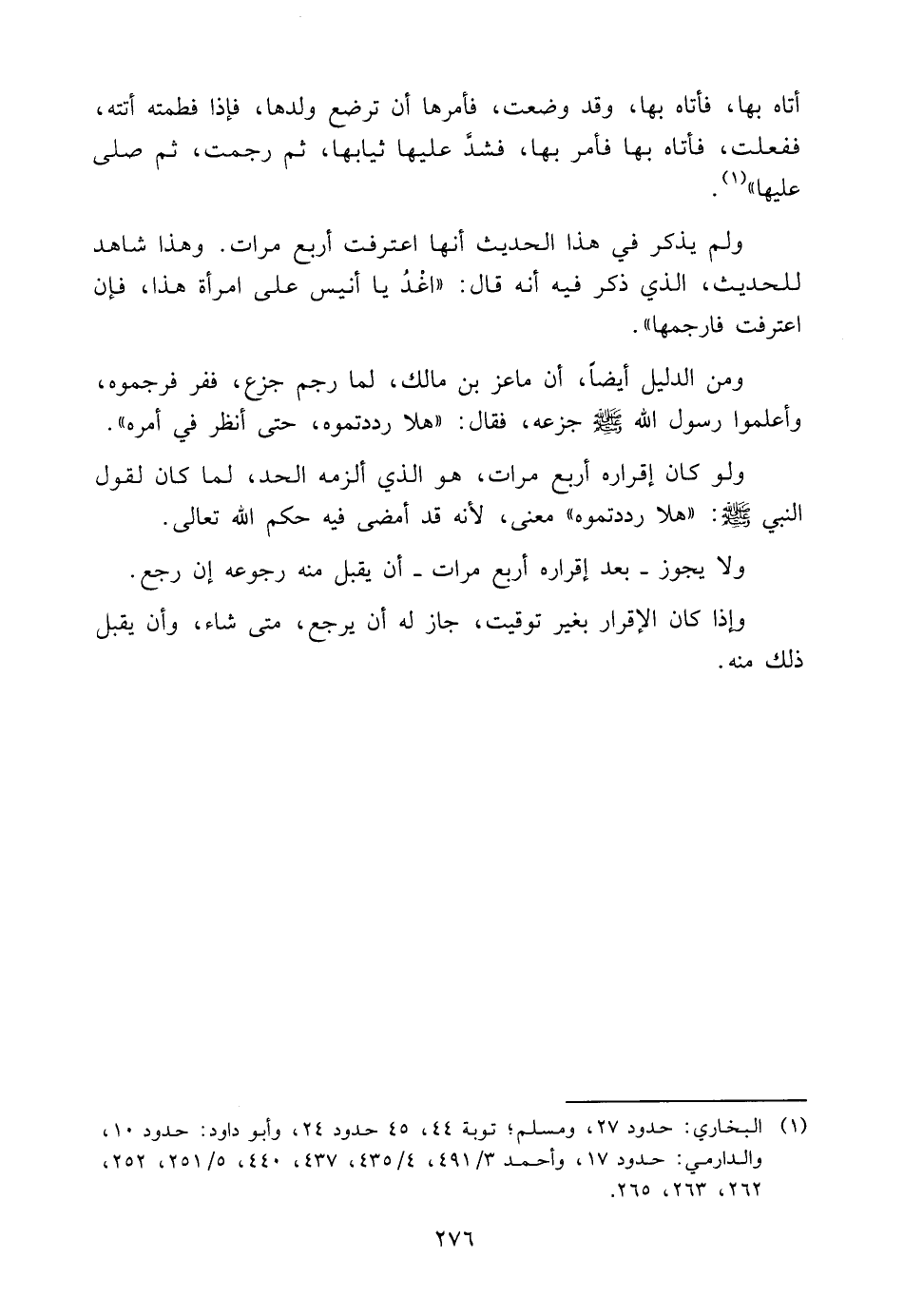 وَلَوْ كَانَ إِقْرَارُهُ أَرْبَعَ مَرَّاتٍ، هُوَ الَّذِي أَلْزَمَهُ الْحَدَّ، لَمَا كَانَ لِقَوْلِ النَّبِيَّ صَلَّى اللَّهُ عَلَيْهِ وَسَلَّمَ: "هَلَّا رَدَدْتُمُوهُ" مَعْنًى، لِأَنَّهُ قَدْ أَمْضَى فِيهِ حُكْمَ اللَّهِ تَعَالَى.