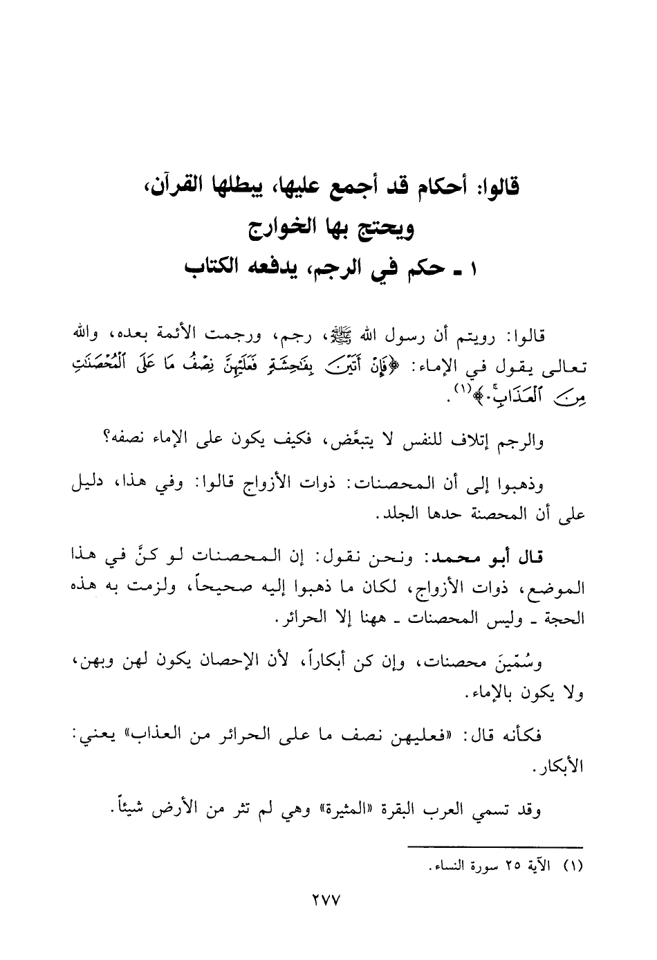 قَالُوا: أَحْكَامٌ قَدْ أُجْمِعَ عَلَيْهَا، يُبْطِلُهَا الْقُرْآنُ، وَيَحْتَجُّ بِهَا الْخَوَارِجُ: