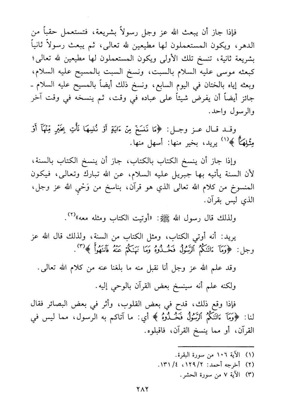 فَإِذَا جَازَ أَنْ يَبْعَثَ اللَّهُ عَزَّ وَجَلَّ رَسُولًا بِشَرِيعَةٍ، فَتُسْتَعْمَلُ حِقَبًا مِنَ الدَّهْرِ، وَيَكُونُ الْمُسْتَعْمِلُونَ لَهَا مُطِيعِينَ لِلَّهِ تَعَالَى، ثُمَّ يَبْعَثُ رَسُولًا ثَانِيًا بِشَرِيعَةٍ ثَانِيَةٍ، تَنْسَخُ تِلْكَ الْأُولَى وَيَكُونُ الْمُسْتَعْمِلُونَ لَهَا مُطِيعِينَ لِلَّهِ تَعَالَى، كَبَعْثِهِ مُوسَى عَلَيْهِ السَّلَامُ بِالسَّبْتِ، وَنُسِخَ السَّبْتُ بِالْمَسِيحِ عَلَيْهِ السَّلَامُ، وَبَعْثِهِ إِيَّاهُ بِالْخِتَانِ فِي الْيَوْمِ السَّابِعِ، وَنُسِخَ ذَلِكَ أَيْضًا بِالْمَسِيحِ عَلَيْهِ السَّلَامُ- جَازَ أَيْضًا أَنْ يَفْرِضَ شَيْئًا عَلَى عِبَادِهِ فِي وَقْتٍ، ثُمَّ يَنْسَخُهُ فِي وَقْتٍ آخَرَ وَالرَّسُولُ وَاحِدٌ.