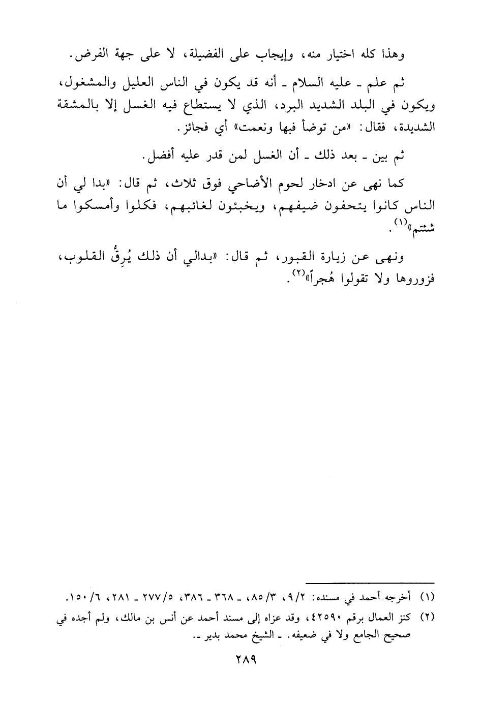 ثُمَّ عَلِمَ -عَلَيْهِ السَّلَامُ- أَنَّهُ قَدْ يَكُونُ فِي النَّاسِ الْعَلِيلُ وَالْمَشْغُولُ، وَيَكُونُ فِي الْبَلَدِ الشَّدِيدِ الْبَرْدِ، الَّذِي لَا يُسْتَطَاعُ فِيهِ الْغُسْلُ إِلَّا بِالْمَشَقَّةِ الشَّدِيدَةِ، فَقَالَ: "مَنْ تَوَضَّأَ فَبِهَا وَنِعْمَتْ" أَيْ فَجَائِزٌ.