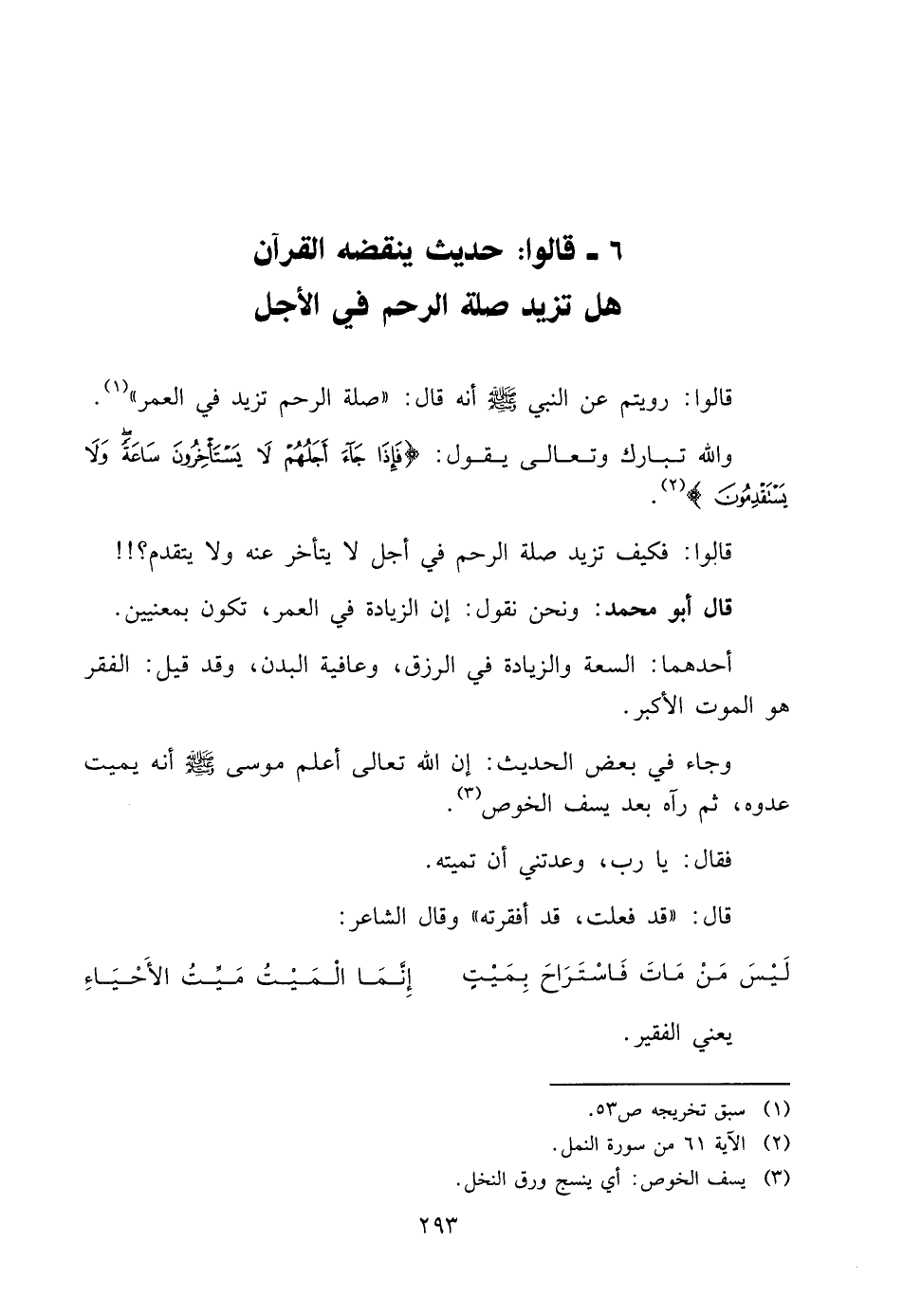 6- قَالُوا: حَدِيثٌ يَنْقُضُهُ الْقُرْآنُ: هَلْ تَزِيدُ صِلَةُ الرَّحِمِ فِي الْأَجَلِ: