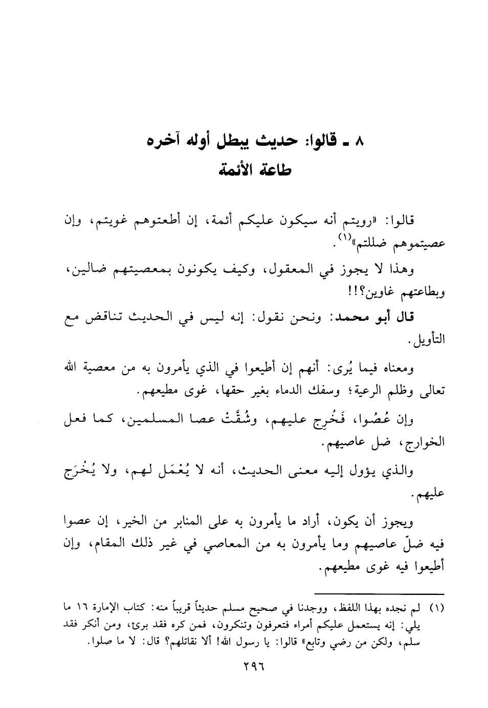 8- قَالُوا حَدِيثٌ يُبْطِلُ أَوَّلُهُ آخِرَهُ- طَاعَةُ الْأَئِمَّةِ: