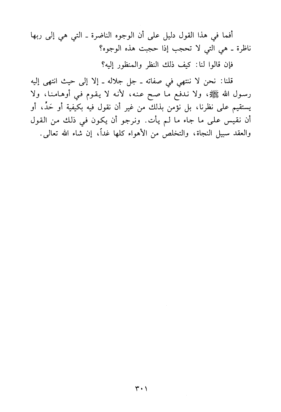 قُلْنَا: نَحْنُ لَا نَنْتَهِي فِي صِفَاتِهِ -جَلَّ جَلَالُهُ- إِلَّا إِلَى حَيْثُ انْتَهَى إِلَيْهِ رَسُولُ اللَّهِ صَلَّى اللَّهُ عَلَيْهِ وَسَلَّمَ، وَلَا نَدْفَعُ مَا صَحَّ عَنْهُ، لِأَنَّهُ لَا يَقُومُ فِي أَوْهَامِنَا، وَلَا يَسْتَقِيمُ عَلَى نَظَرِنَا، بَلْ نُؤْمِنُ بِذَلِكَ مِنْ غَيْرِ أَنْ نَقُولَ فِيهِ بِكَيْفِيَّةٍ أَوْ حَدٍّ، أَوْ أَنْ نَقِيسَ عَلَى مَا جَاءَ مَا لَمْ يَأْتِ. وَنَرْجُو أَنْ يَكُونَ فِي ذَلِكَ مِنَ الْقَوْلِ وَالْعَقْدِ سَبِيلُ النَّجَاةِ، وَالتَّخَلُّصِ مِنَ الْأَهْوَاءِ كُلِّهَا غَدًا، إِنْ شَاءَ الله تَعَالَى.
