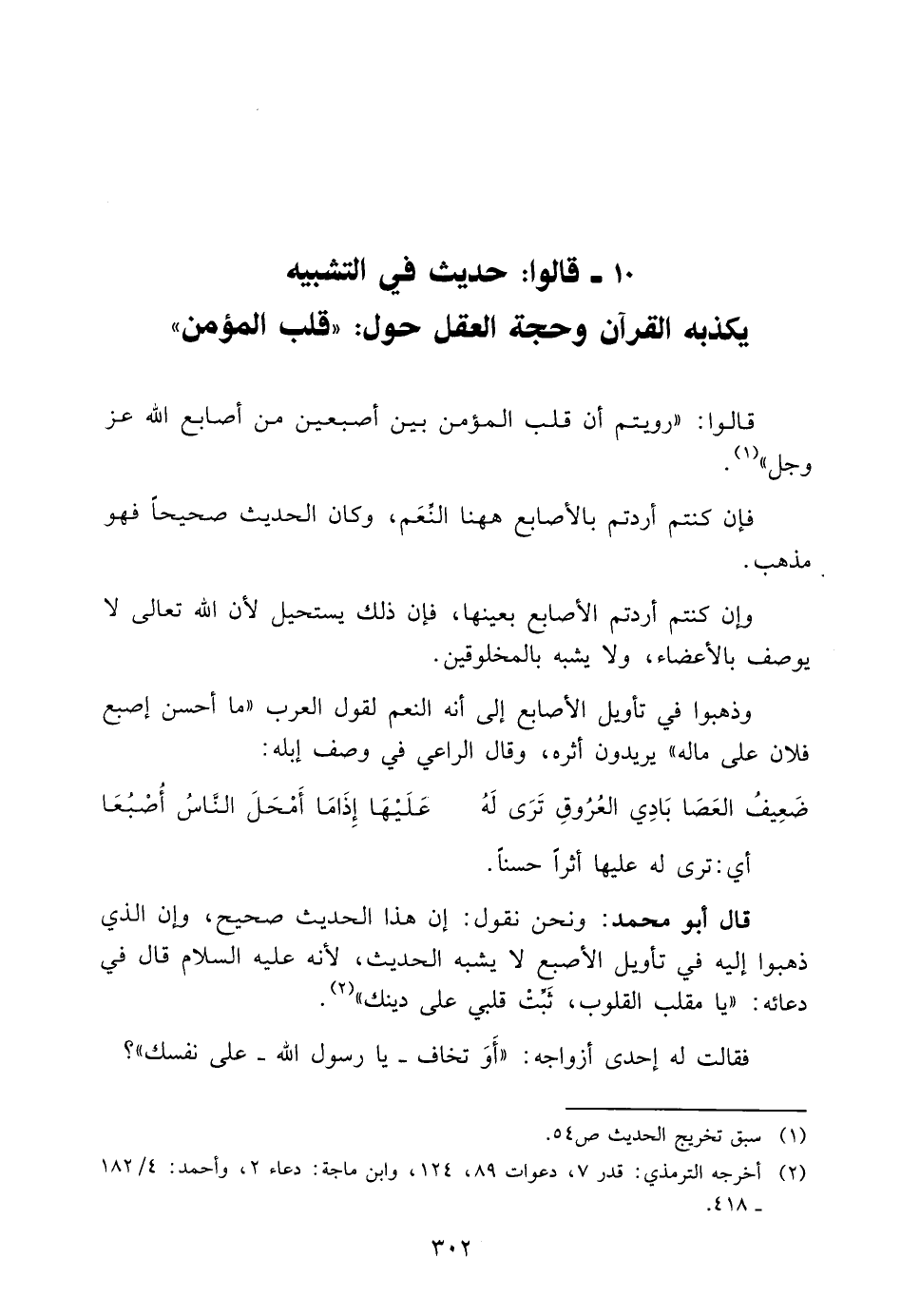 وَنَحْنُ نَقُولُ: إِنَّ هَذَا الْحَدِيثَ صَحِيحٌ، وَإِنَّ الَّذِي ذَهَبُوا إِلَيْهِ فِي تَأْوِيلِ الْإِصْبَعِ لَا يُشْبِهُ الْحَدِيثَ، لِأَنَّهُ عَلَيْهِ السَّلَامُ قَالَ فِي دُعَائِهِ: "يَا مُقَلِّبَ الْقُلُوبِ، ثَبِّتْ قَلْبِي عَلَى دِينِكَ" 2.