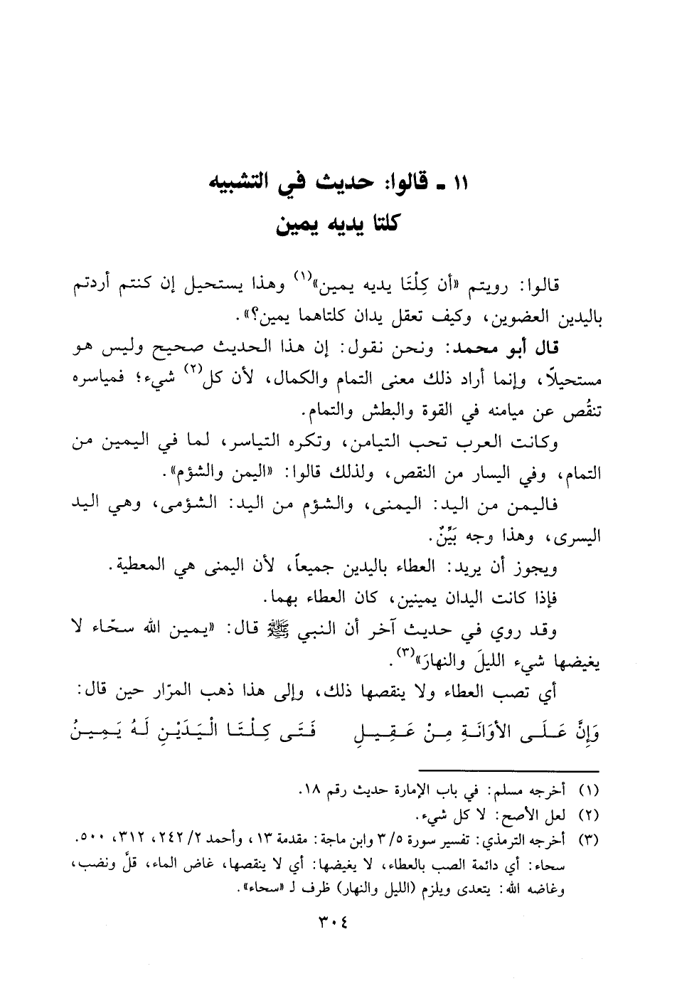 11- قَالُوا: حَدِيثٌ فِي التَّشْبِيهِ- كِلْتَا يَدَيْهِ يَمِينٌ: