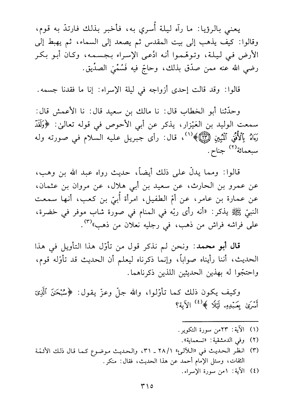 وَكَيْفَ يَكُونُ ذَلِكَ كَمَا تَأَوَّلُوا، وَاللَّهُ جَلَّ وَعَزَّ يَقُولُ: {سُبْحَانَ الَّذِي أَسْرَى بِعَبْدِهِ لَيْلًا} 4 الْآيَة؟