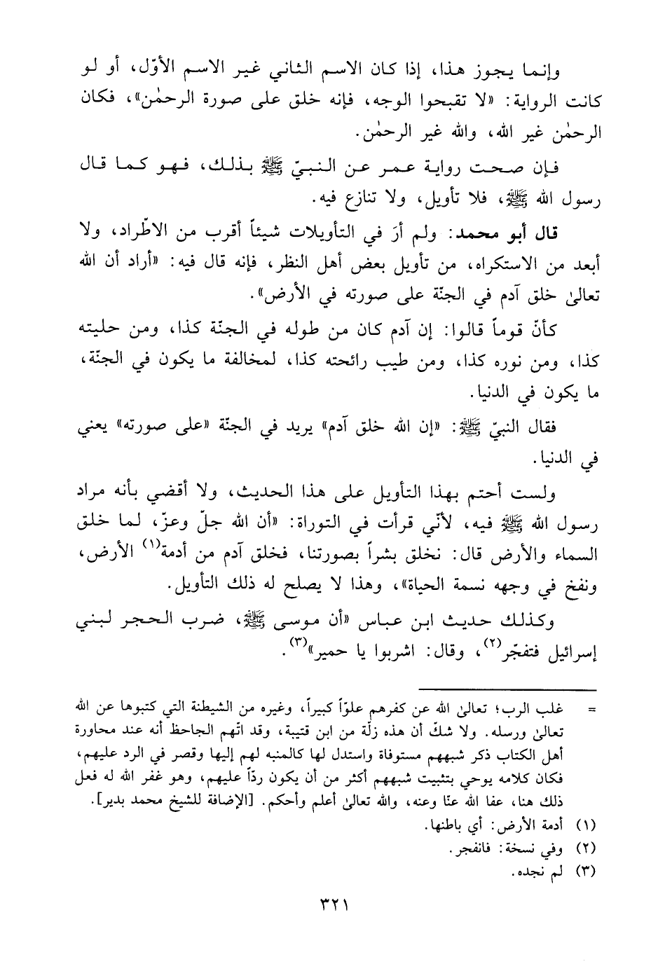 وَلَسْتُ أُحَتِّمُ بِهَذَا التَّأْوِيلِ عَلَى هَذَا الْحَدِيثِ، وَلَا أَقْضِي بِأَنَّهُ مُرَادِ رَسُولِ اللَّهِ صَلَّى اللَّهُ عَلَيْهِ وَسَلَّمَ فِيهِ، لِأَنِّي قَرَأْتُ فِي التَّوْرَاةِ: "أَنَّ اللَّهَ جَلَّ وَعَزَّ، لَمَّا خَلَقَ السَّمَاءَ وَالْأَرْضَ قَالَ: نَخْلُقُ بَشَرًا بِصُورَتِنَا، فَخَلَقَ آدَمَ مِنْ أُدْمَةِ1 الْأَرْضِ، وَنَفَخَ فِي وَجْهِهِ نَسَمَةَ الْحَيَاةِ"، وَهَذَا لَا يَصْلُحُ لَهُ ذَلِكَ التَّأْوِيلُ.