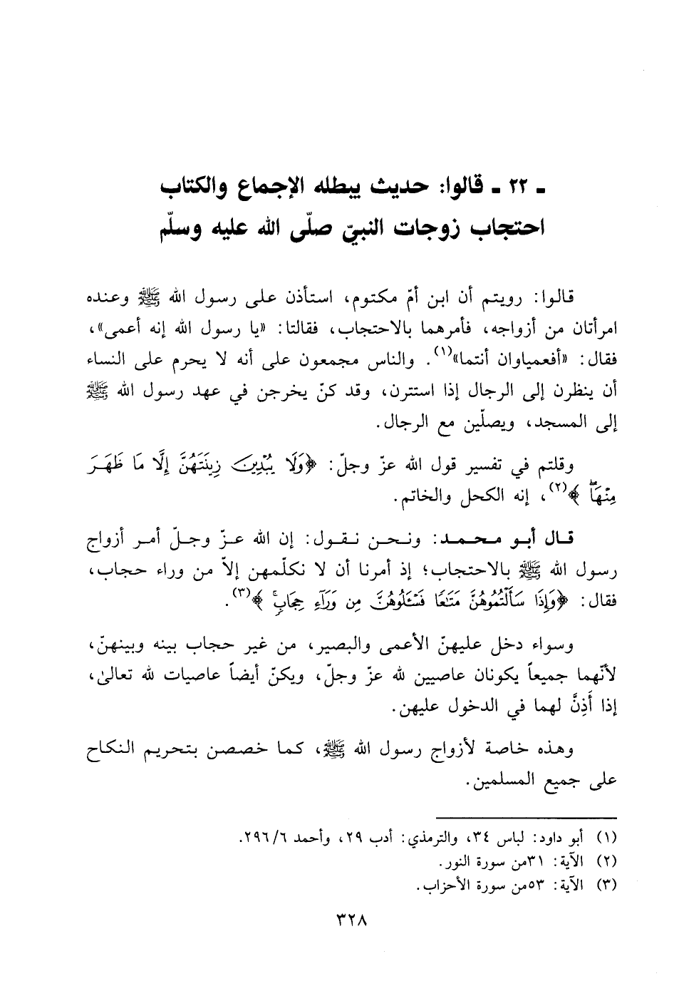 22- قَالُوا: حَدِيثٌ يُبْطِلُهُ الْإِجْمَاعُ وَالْكِتَابُ- احْتِجَابُ زَوْجَاتِ النَّبِيِّ صَلَّى اللَّهُ عَلَيْهِ وَسَلَّمَ: