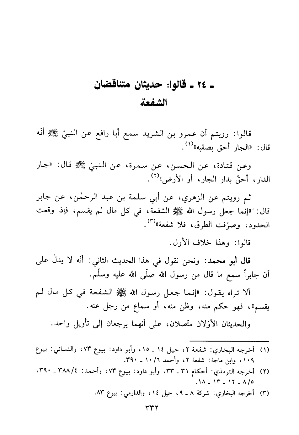 24- قَالُوا: حَدِيثَانِ مُتَنَاقِضَانِ- الشُّفْعَةُ: