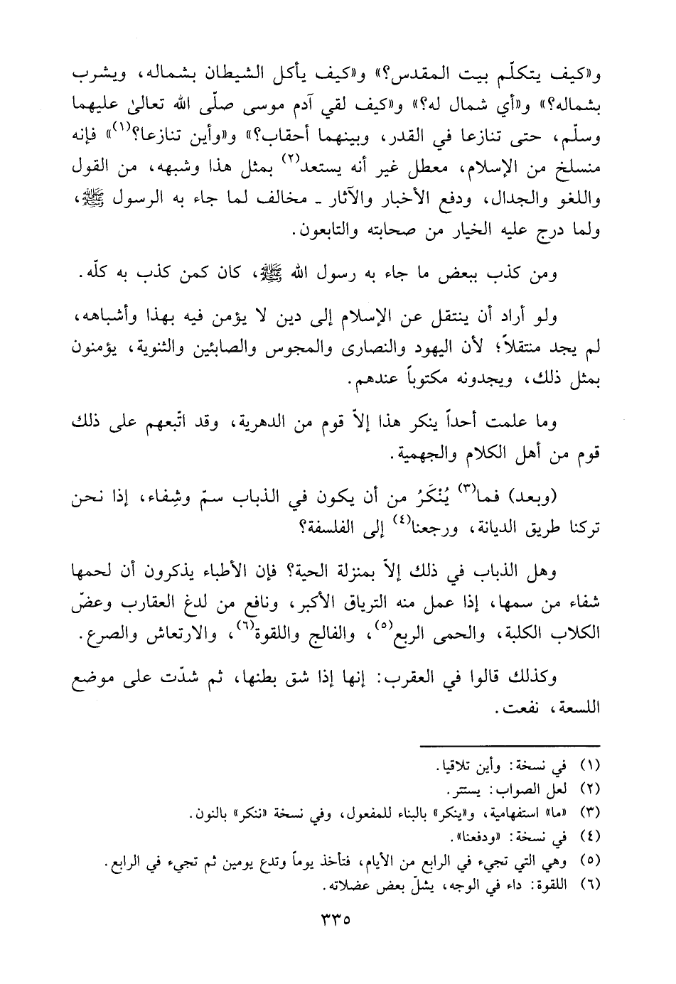 "وَبَعْدُ" فَمَا3 يُنْكَرُ مِنْ أَنْ يَكُونَ فِي الذُّبَابِ سُمٌّ وَشِفَاءٌ، إِذَا نَحْنُ تَرَكْنَا طَرِيقَ الدِّيَانَةِ، وَرَجَعْنَا4 إِلَى الْفَلْسَفَةِ؟