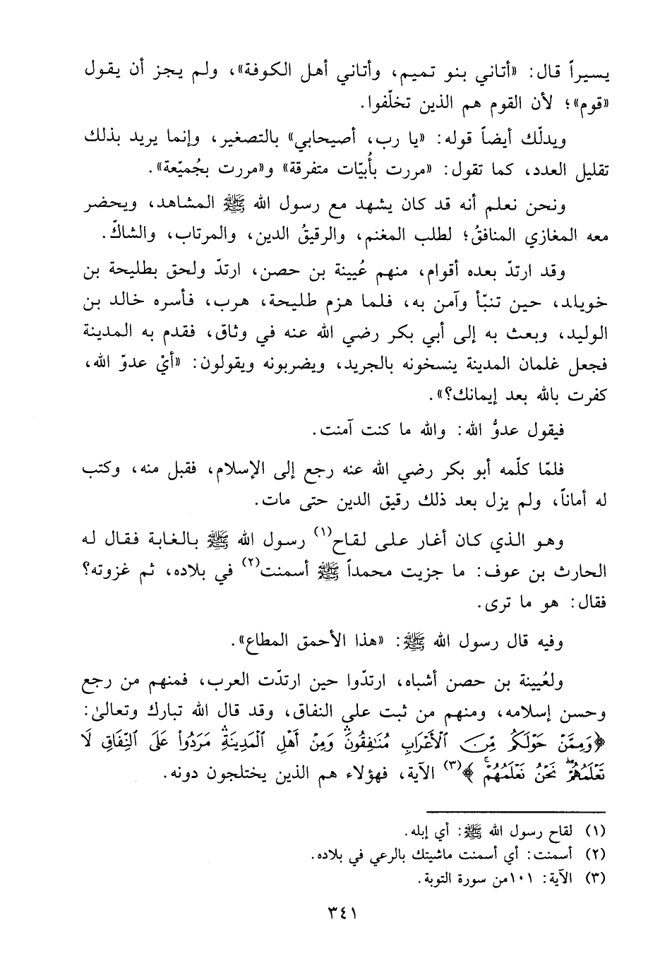 وَلِعُيَيْنَةَ بْنِ حِصْنٍ أَشْبَاهٌ، ارْتَدُّوا حِينَ ارْتَدَّتِ الْعَرَبُ، فَمِنْهُمْ مَنْ رَجَعَ وَحَسُنَ إِسْلَامُهُ، وَمِنْهُمْ مَنْ ثَبَتَ عَلَى النِّفَاقِ، وَقَدْ قَالَ اللَّهُ تَبَارَكَ وَتَعَالَى: {وَمِمَّنْ حَوْلَكُمْ مِنَ الْأَعْرَابِ مُنَافِقُونَ وَمِنْ أَهْلِ الْمَدِينَةِ مَرَدُوا عَلَى النِّفَاقِ لَا تَعْلَمُهُمْ نَحْنُ نَعْلَمُهُمْ} 3 الْآيَةَ، فَهَؤُلَاءِ هُمُ الَّذِينَ يَخْتَلِجُونَ دونه.