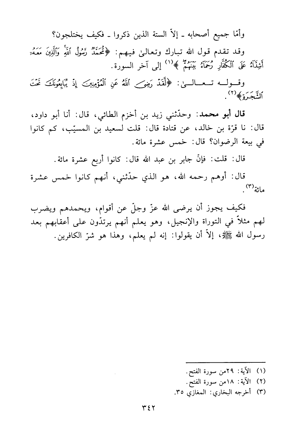 فَكَيْفَ يَجُوزُ أَنْ يَرْضَى اللَّهُ عَزَّ وَجَلَّ عَنْ أَقْوَامٍ، وَيَحْمَدَهُمْ وَيَضْرِبَ لَهُمْ مَثَلًا فِي التَّوْرَاةِ وَالْإِنْجِيلِ، وَهُوَ يَعْلَمُ أَنَّهُمْ يَرْتَدُّونَ عَلَى أَعْقَابِهِمْ بَعْدَ رَسُولِ اللَّهِ صَلَّى اللَّهُ عَلَيْهِ وَسَلَّمَ، إِلَّا أَنْ يَقُولُوا: إِنَّهُ لَمْ يَعْلَمْ، وَهَذَا هُوَ شَرُّ الْكَافرين.